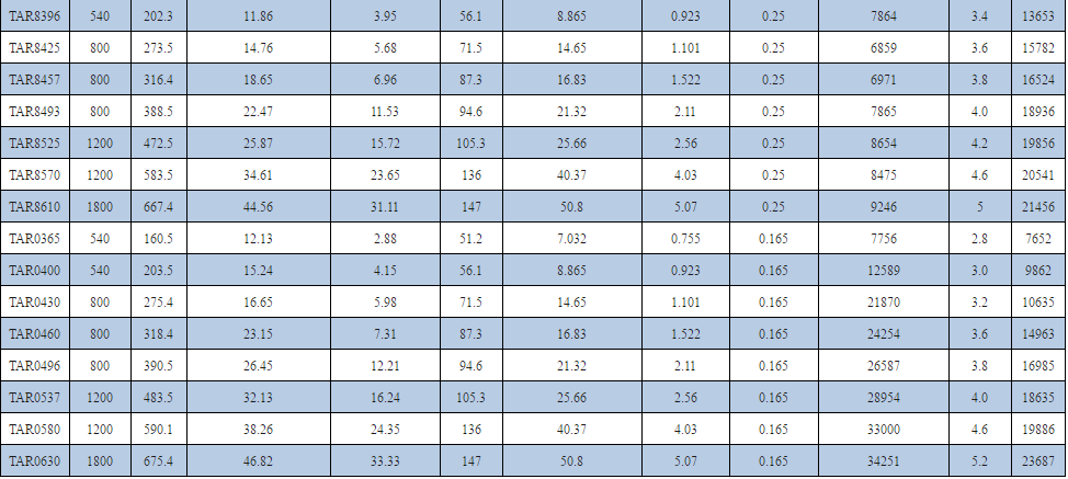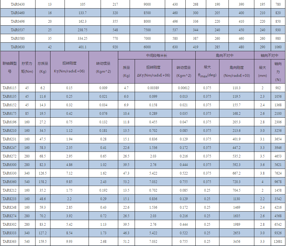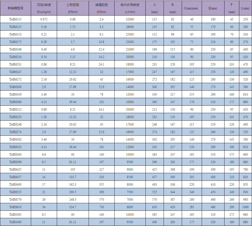 TAR系列膜片聯軸器產品介紹: ◆聯軸器尺寸C、L、E、F是根據使用性能推薦的標準值,可按用戶要求設計。其它尺寸的L值,其扭轉剛度、轉動慣量等應另算; ◆徑向不對中數值是角向不