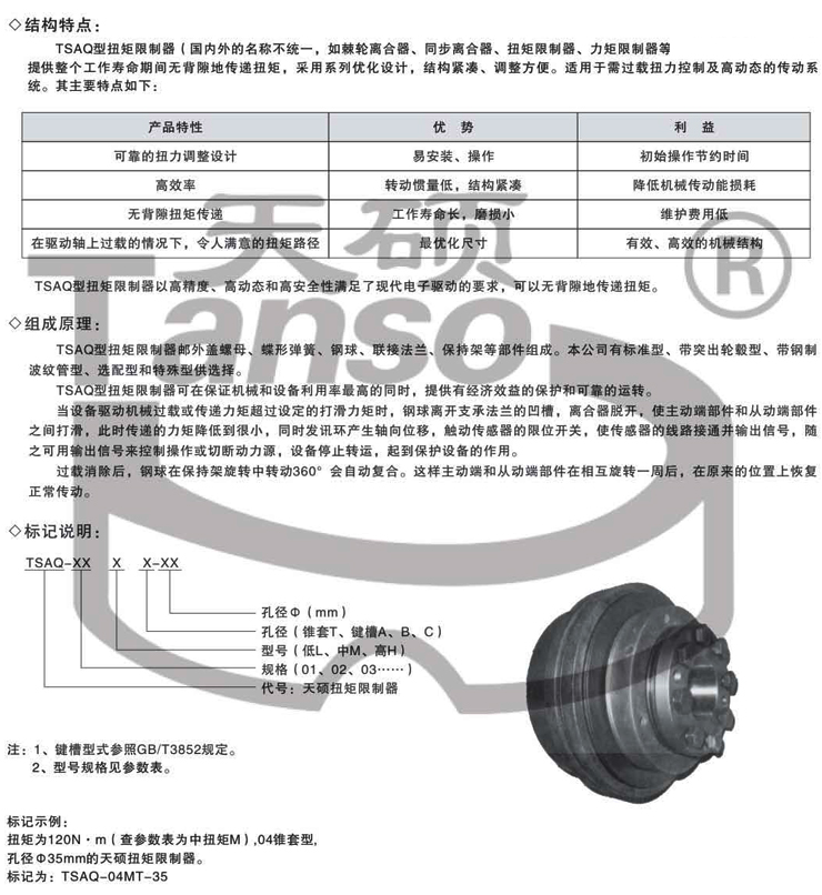 鋼球式扭力限制器工作原理:采用精密彈簧控制臨界扭矩,可以達到非常精準的扭矩值,同一外形尺寸產品,可以更換不同的內置彈簧來確定不同的打滑扭矩,用于一端是軸,一端是輪的安裝,消除過載后,復位方式為一圈唯一位置復位,可外接限位開關,過載時輸出電信號。